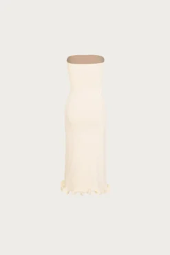 This fitted sweater combines clean lines with unexpected details for a sculptural look. Crafted from a midweight viscose knit, giving a luxurious feel while maintaining structure. The bottom panel, starting at the natural waist, is designed with a ribbed texture to create a more defined fit, while the silhouette is true to size—fitted through the body and slightly looser at the chest for added comfort. The elegant boat neckline and ruffle sleeve detailing elevate the silhouette. A versatile wardrobe staple, this sweater pairs effortlessly with tailored trousers or layers beautifully under outerwear for year-round styling.