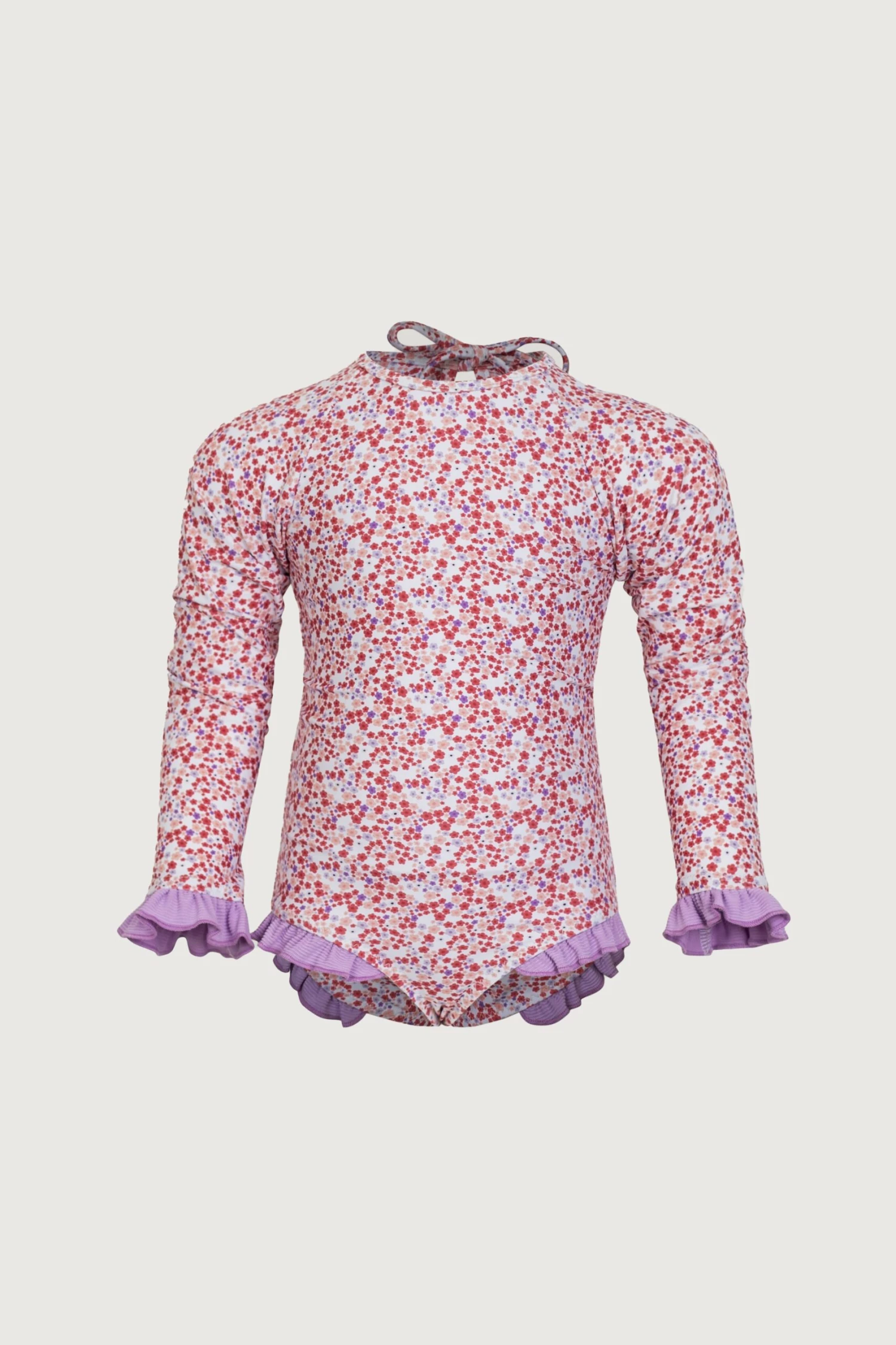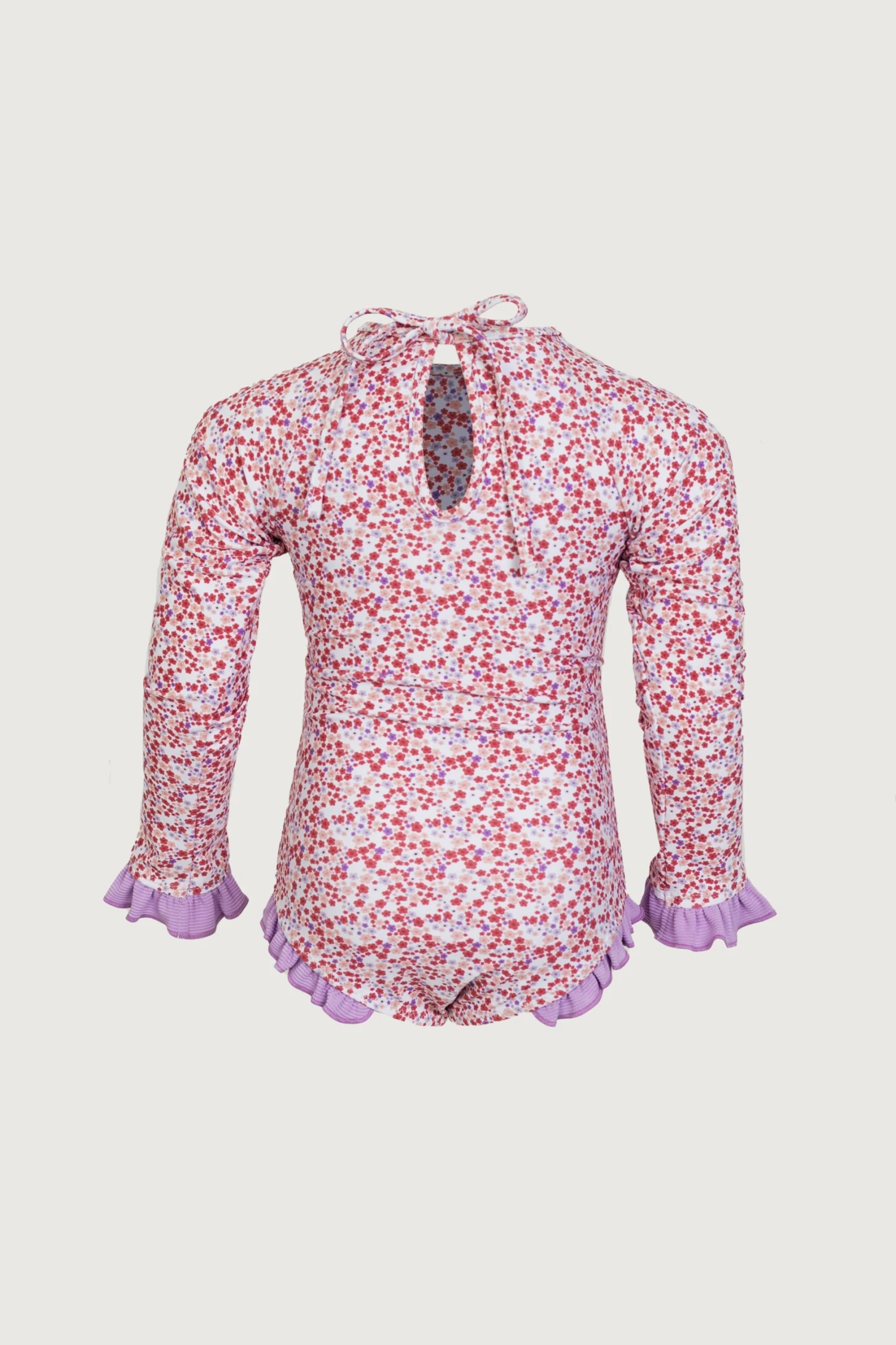 This one-piece rashguard will protect your mini from the sun in style. It features a keyhole tie closure at the back and ruffle details at the sleeves and leg openings.
