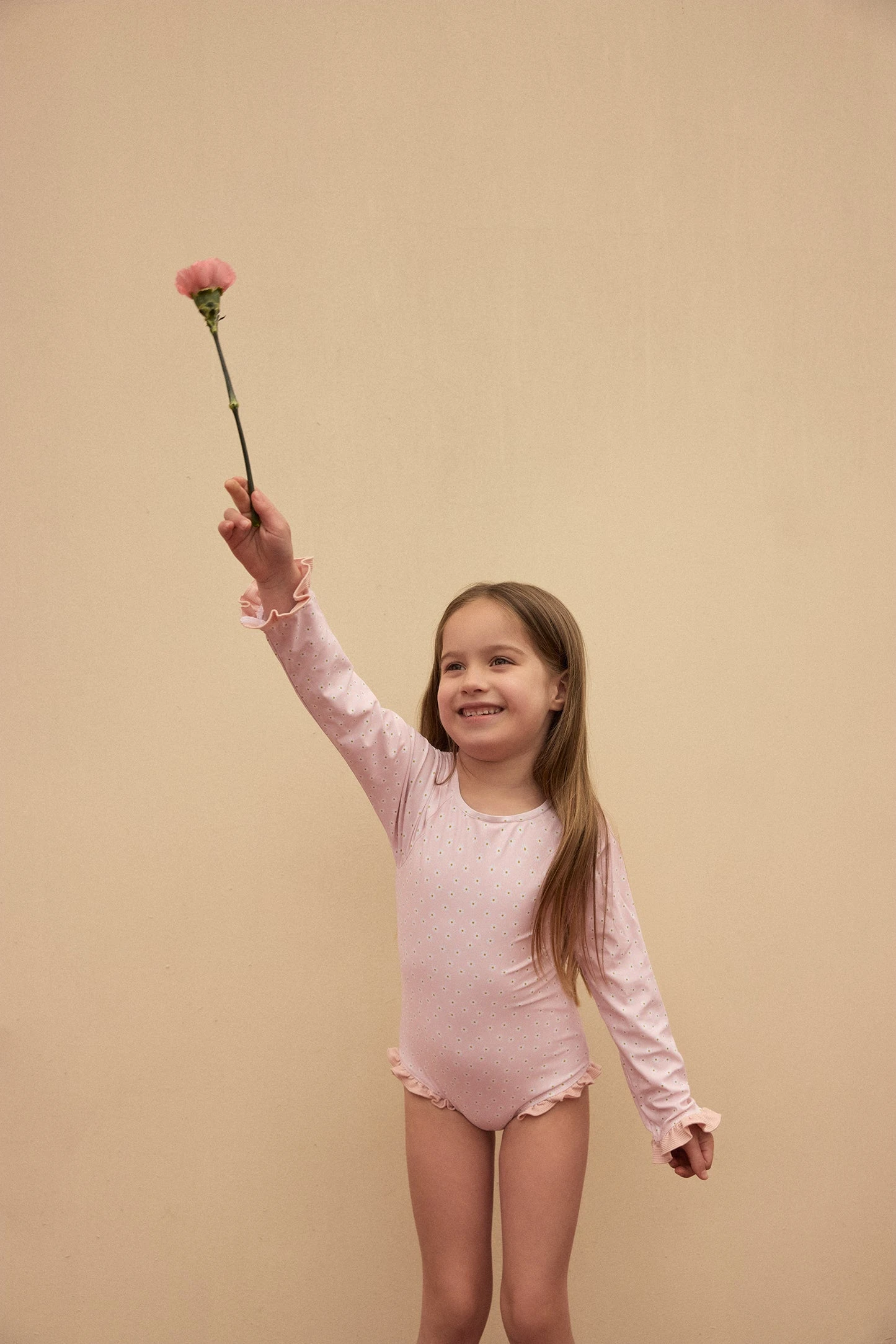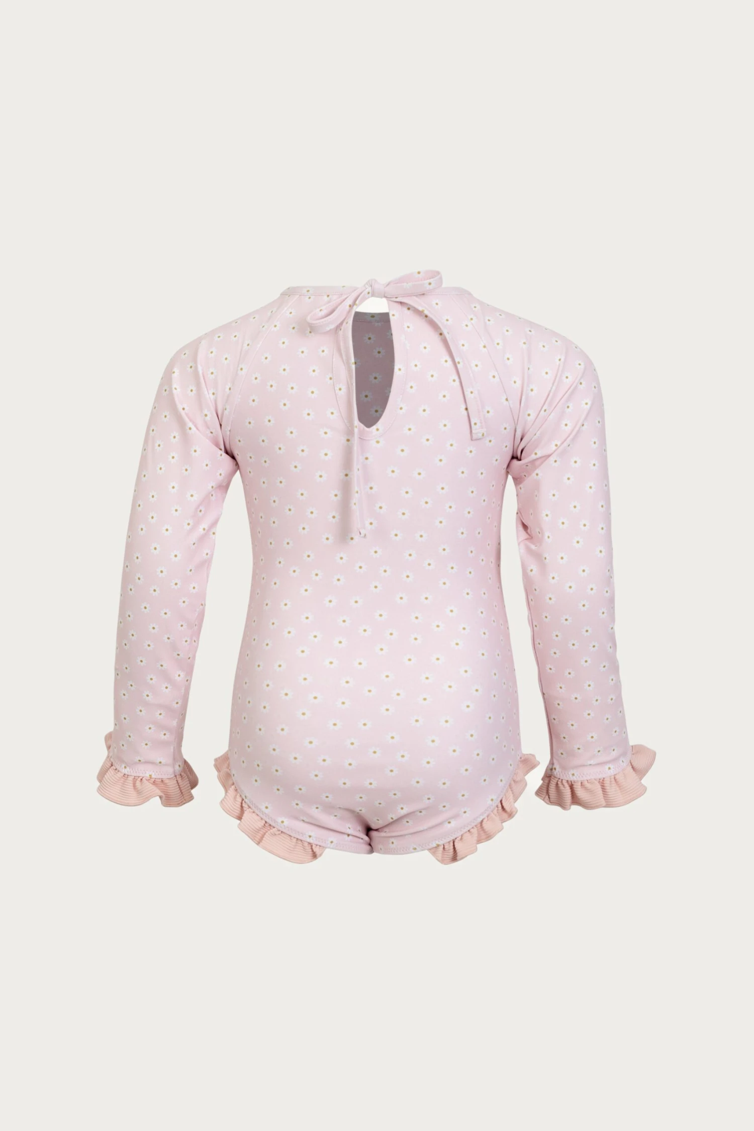 This one-piece rashguard will protect your mini from the sun in style. It features a keyhole tie closure at the back and ruffle details at the sleeves and leg openings.